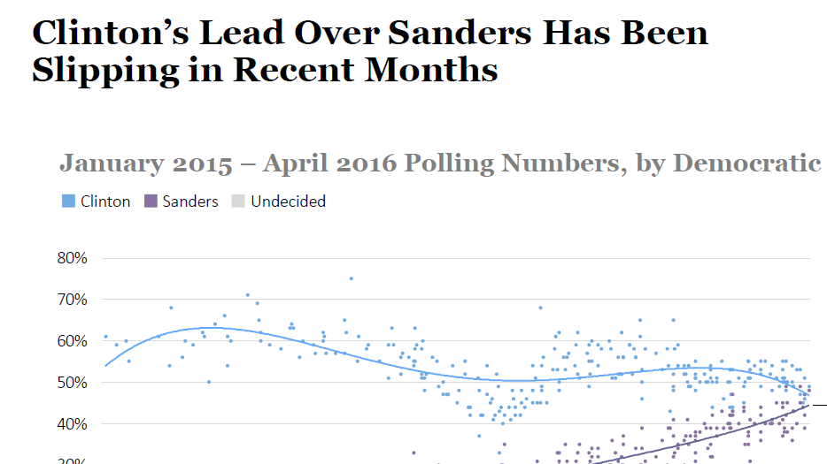 A new Emerson College poll has Hillary Clinton leading Bernie Sanders 56%-38% in New York, ahead of their April 19 showdown there. While that's still a daunting gap, Sanders has narrowed it from a 48-point advantage for Clinton in the last Emerson poll, taken last month. Meanwhile, a new Field Poll out of California, Clinton's lead is down to six points. She leads 47%-41%, down from a double-digit lead in January.