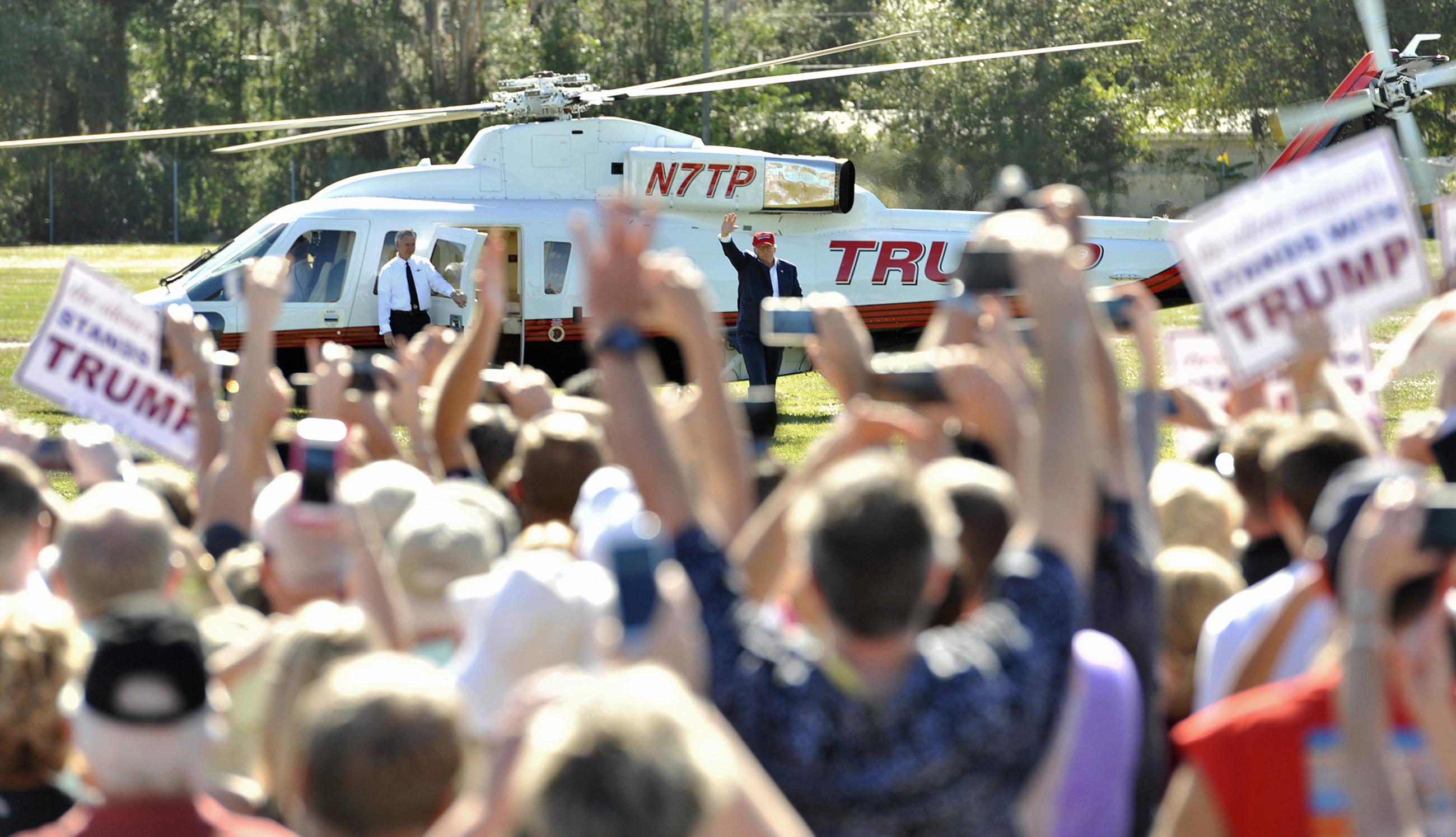 Republican presidential hopeful Donald Trump arrives by helicopter to speak with supporters at a campaign rally on Saturday at Robarts Arena in Sarasota, Florida.