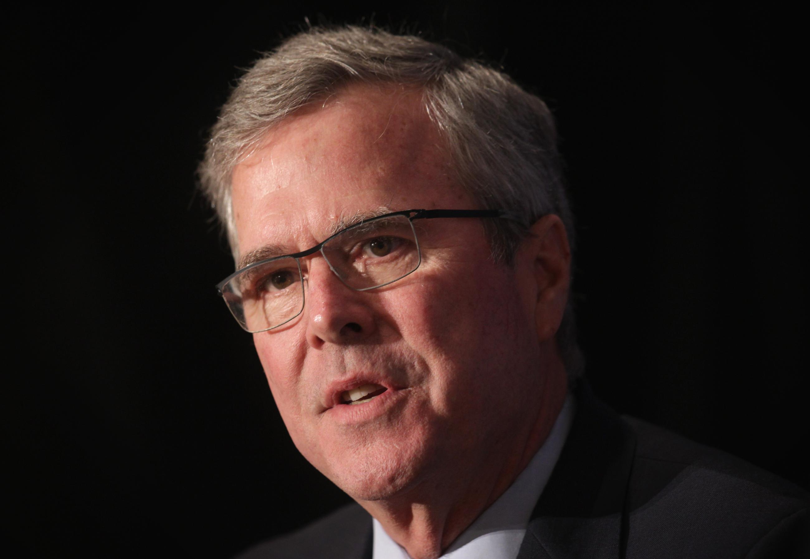 Republican U.S. presidential hopeful and former Florida governor Jeb Bush participates in a discussion with the Editor of the National Review, Rich Lowry, during the National Review Institute 2015 Ideas Summit on April 30, 2015 in Washington, D.C.