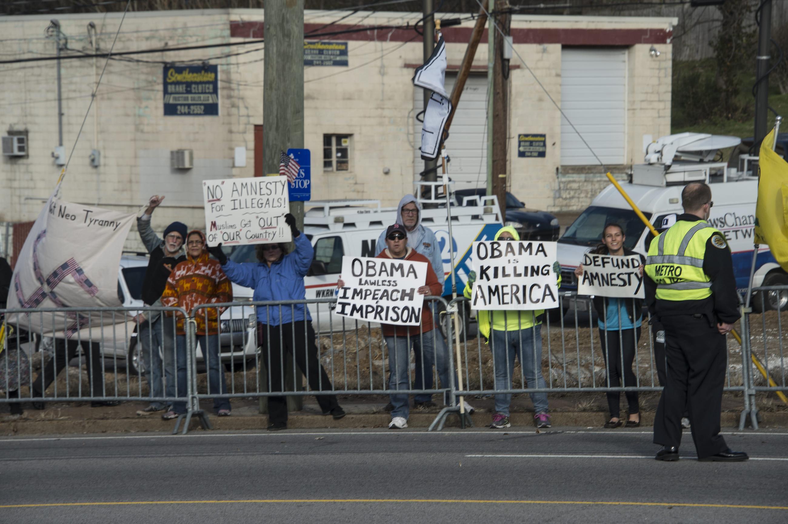 Protesters wave signs as US President Barack Obama arrives to speak about his recent executive actions on immigration on December 9, 2014 at the Casa Azafran, a community center and home to a number of immigrant-related nonprofit organizations, in Nashville, Tennessee.