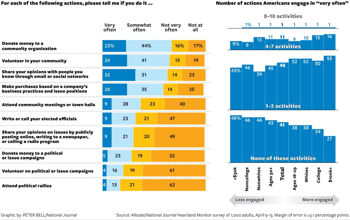 Forty-one percent of Americans do not participate very often in any of 10 bedrock activities of American civic and political life, according to the latest Allstate/National Journal Heartland Monitor survey.