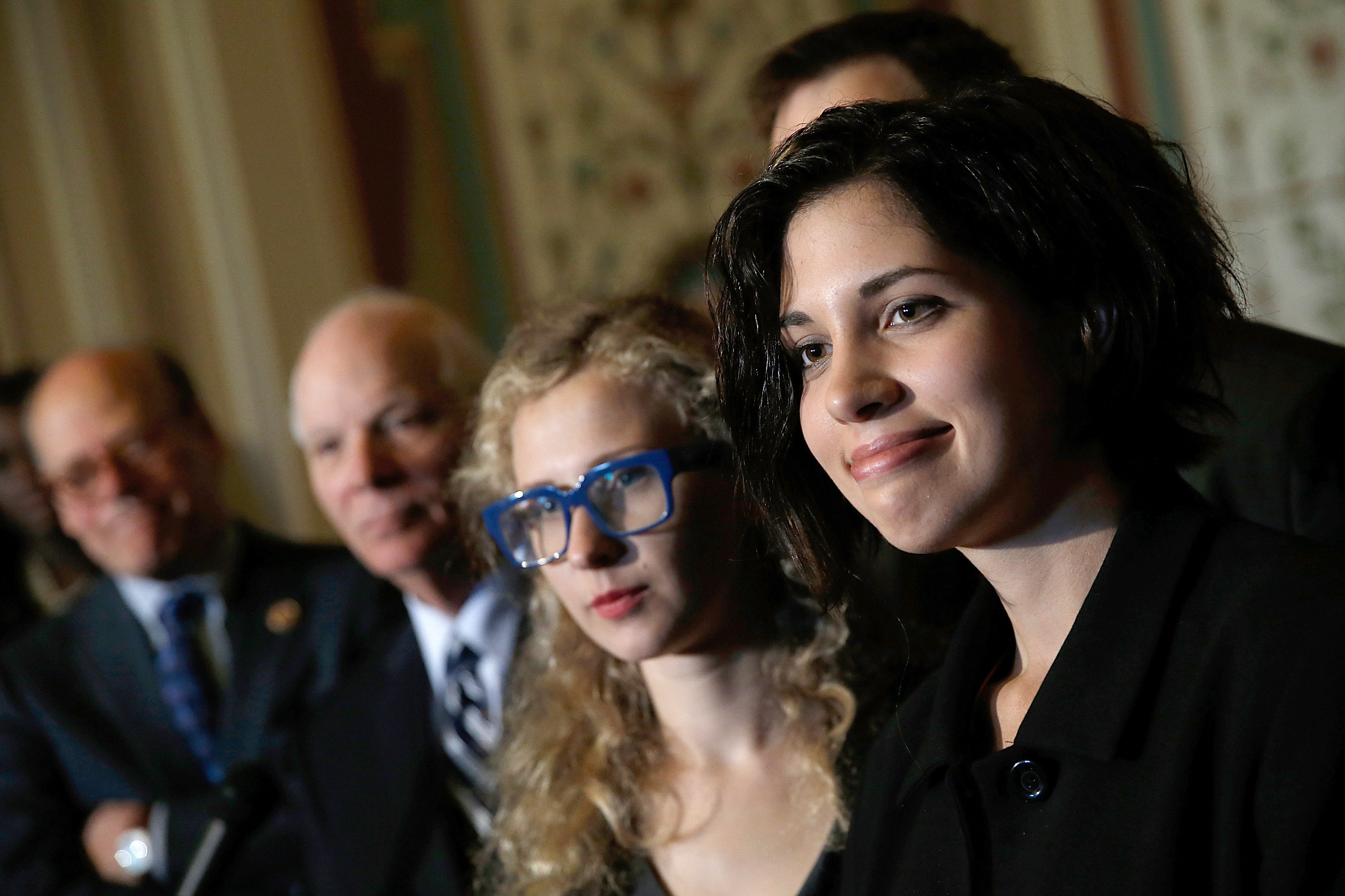 Members of Pussy Riot met with lawmakers on Capitol Hill on Tuesday, in an effort to highlight human-rights abuses in Russia. They also came armed with a list of 16 Russian authorities they want sanctioned by the United States for human-rights abuses.