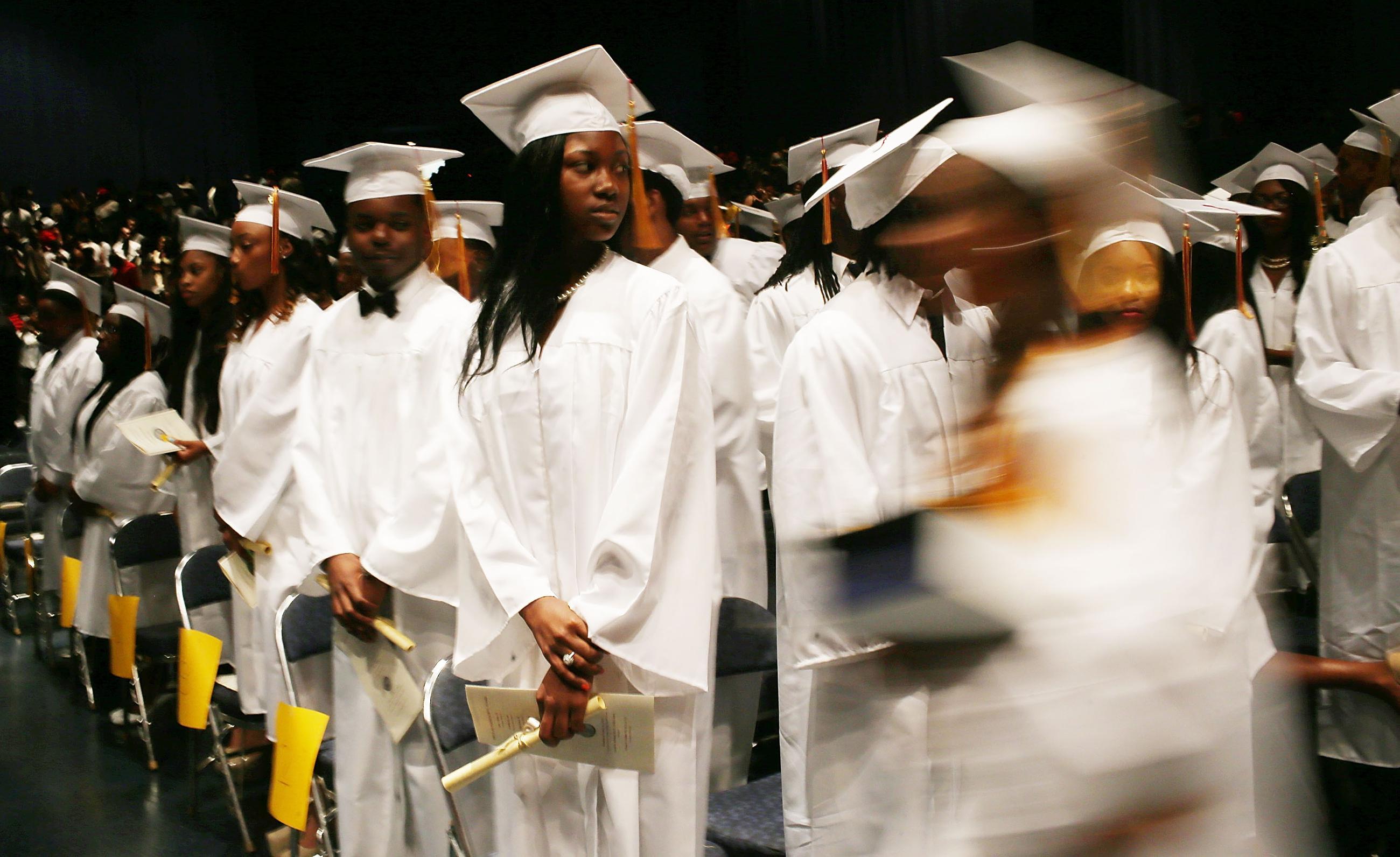 NEW ORLEANS, LA - MAY 14: McDonogh #35 Senior High School graduates stand at their commencement at the Ernest N. Morial Convention Center on May 14, 2015 in New Orleans, Louisiana. Thousands of Hurricane Katrina survivors attempted to use the convention center as a shelter of last resort in the days following the storm, yet it lacked power, water, food and medical supplies. McDonogh 35 was damaged by flooding from Hurricane Katrina and was the first high school for African-Americans in the state of Louisiana. It is one of the last remaining traditional public schools in the city. The tenth anniversary of Hurricane Katrina, which killed at least 1836 and is considered the costliest natural disaster in U.S. history, is August 29. (Photo by Mario Tama/Getty Images)