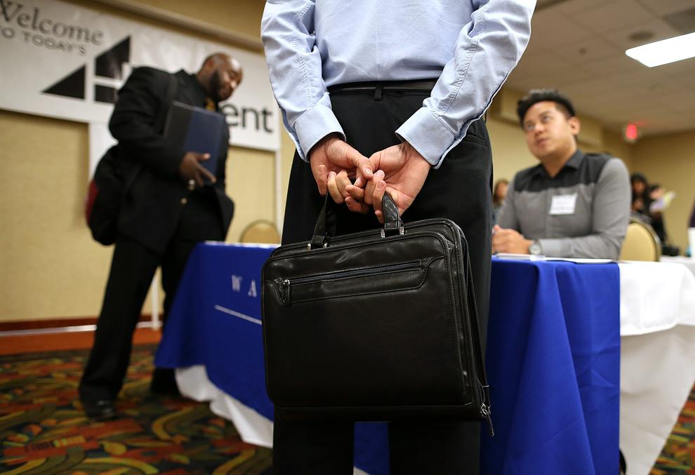 EMERYVILLE, CA - OCTOBER 08: A job seeker meets with a recruiter during the East Bay's HIREvent on October 8, 2013 in Emeryville, California. Dozens of job seekers attended the East Bay's HIREvent where several employers were recruiting for 650 available jobs.