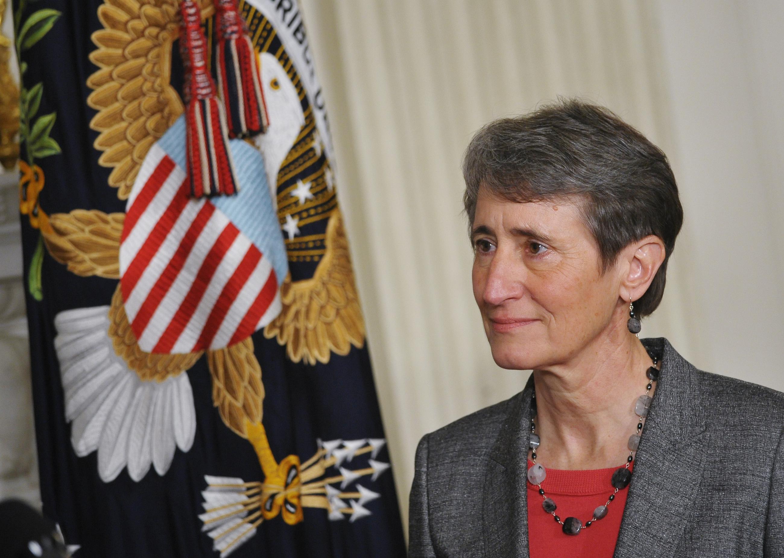 US President Barack Obama(not seen) announces his choice of Sally Jewell, president and CEO of Recreational Equipment Inc. (REI), to be the next Secretary of the Interior in the State Dining Room of the White House on February 6, 2013 in Washington, DC. Jewell will replace Ken Salazar who is stepping down.