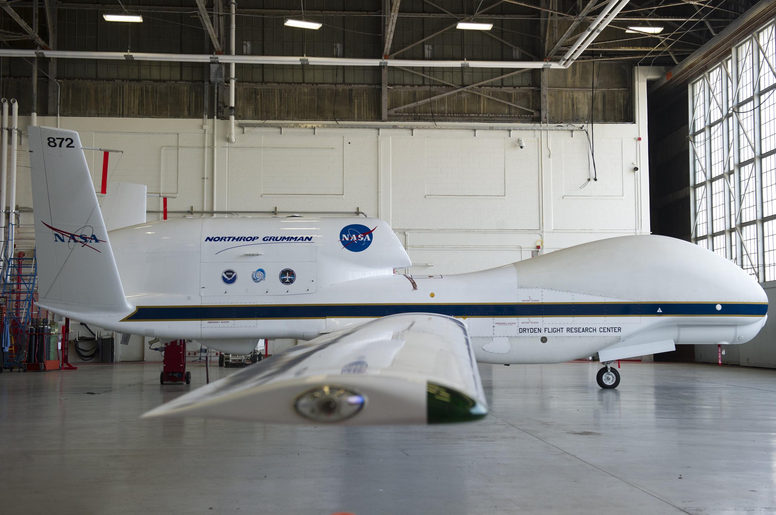 A NASA Global Hawk unmanned aerial vehicle, or drone aircraft, is stored inside an airplane hangar during a Hurricane and Severe Storm Sentinel, or HS3, mission at NASA's Wallops Flight Facility in Wallops Island, Virginia, on September 10, 2013. The HS3 mission uses two of the unmanned aircraft to fly over tropical storms and hurricanes to monitor weather conditions, utlilizing the Global Hawk's ability to fly as high as 19.8 km (12.3 miles), as far as 20,278 km (12,600 miles) and stay in the air for as long as 28 hours.