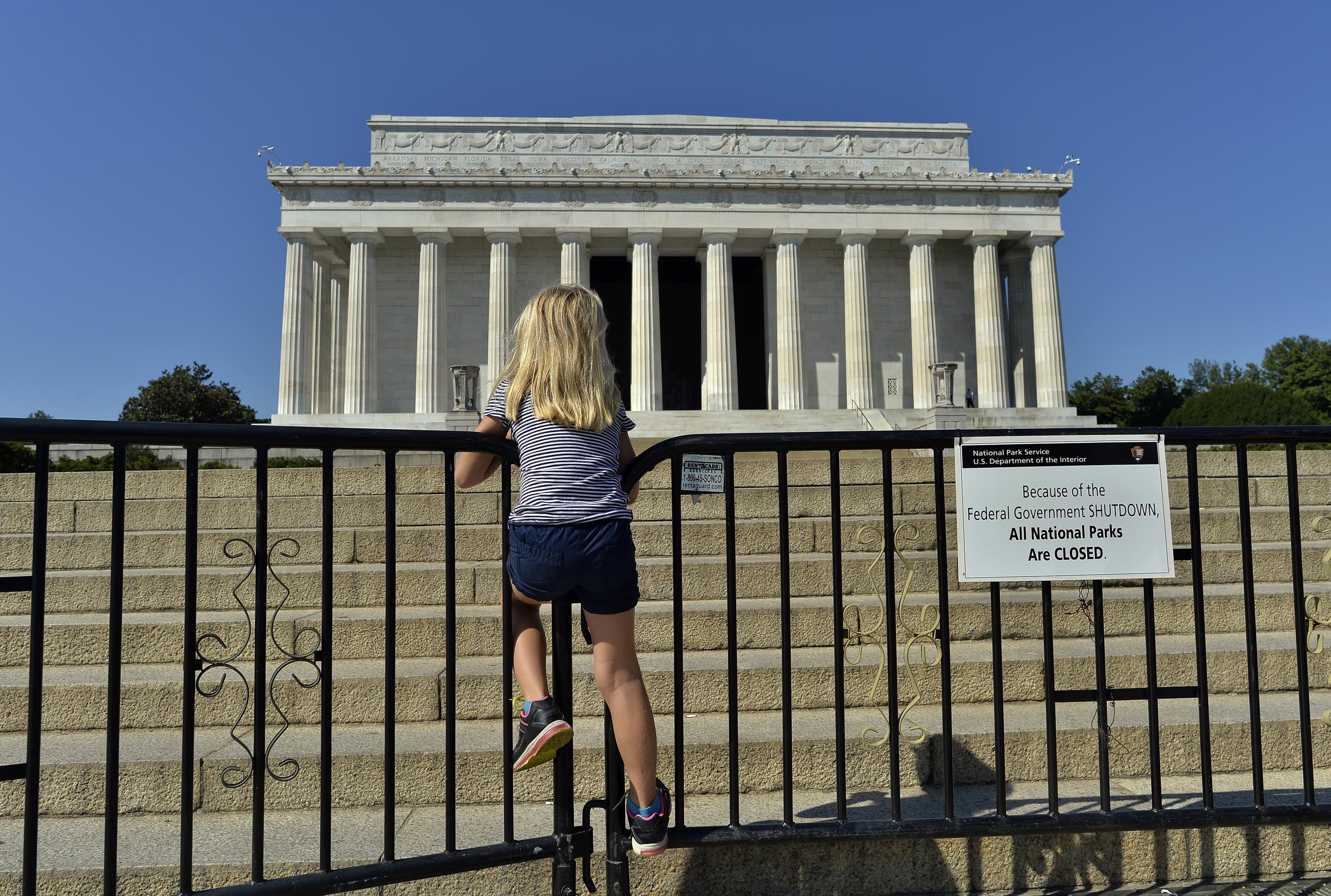 A child stands on the barricade around the Lincoln Memorial on Oct. 2, the second day of the federal government shutdown.