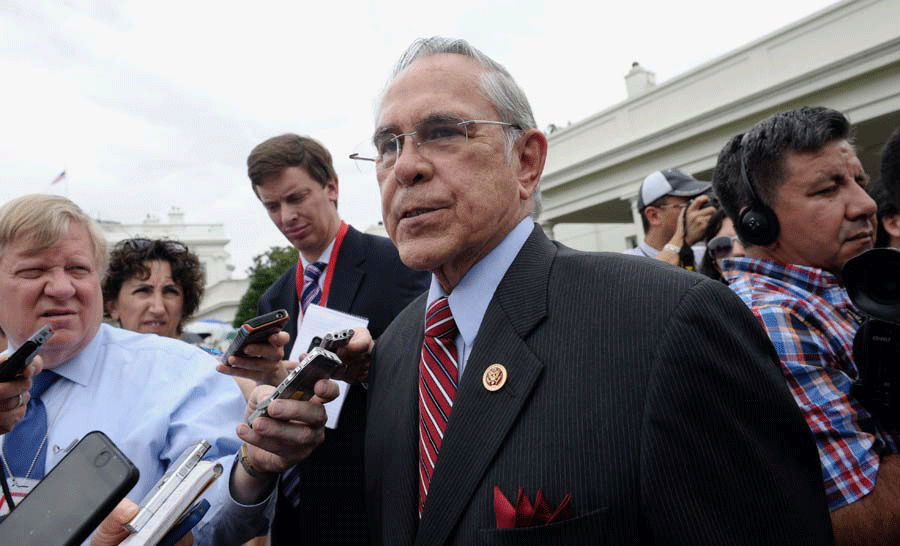Rep. Ruben Hinojosa, D-Texas peaks to reporters outside the White House in Washington, Wednesday, July 10, 2013, following a meeting between President Barack Obama and members of the Congressional Hispanic Caucus. The president planned to meet with the 26-member Congressional Hispanic Caucus on their shared goal of passing an immigration overhaul bill in the House.