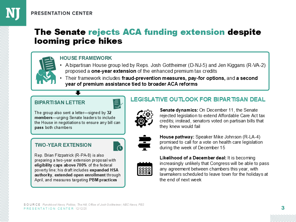 Conversations between House GOP moderates and their party’s leadership were focused on getting a floor vote on their proposals. Negotiations over an amendment vote to an alternative GOP health care plan introduced by leadership—one that did not include an extension of ACA subsidies—had collapsed last week, prompting the moderate Republicans to sign onto the opposing party’s measure. The alternative health care package, the Lower Health Care Premiums for All Americans Act, narrowly passed the House but is expected to be DOA in the Senate.