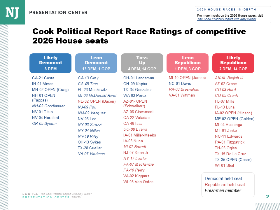 Pennsylvania was Ground Zero for Republicans’ takeover of the White House and Congress in 2024, leaving Democrats to claw back ground in the Keystone State this cycle. Their best pickup opportunity is in the Lehigh Valley, where the freshman Republican faces an uphill reelection fight despite the president having carried the district by 3 points. Mackenize is the most vulnerable Republican incumbent despite an unsettled Democratic primary. Even with a crowded field, Democratic Gov. Josh Shapiro is making flipping seats a priority as he campaigns for another term and lays the groundwork for a potential presidential bid. One of the most popular governors in the country, Shapiro is going to lend his political support to whoever emerges from the Democratic primary.